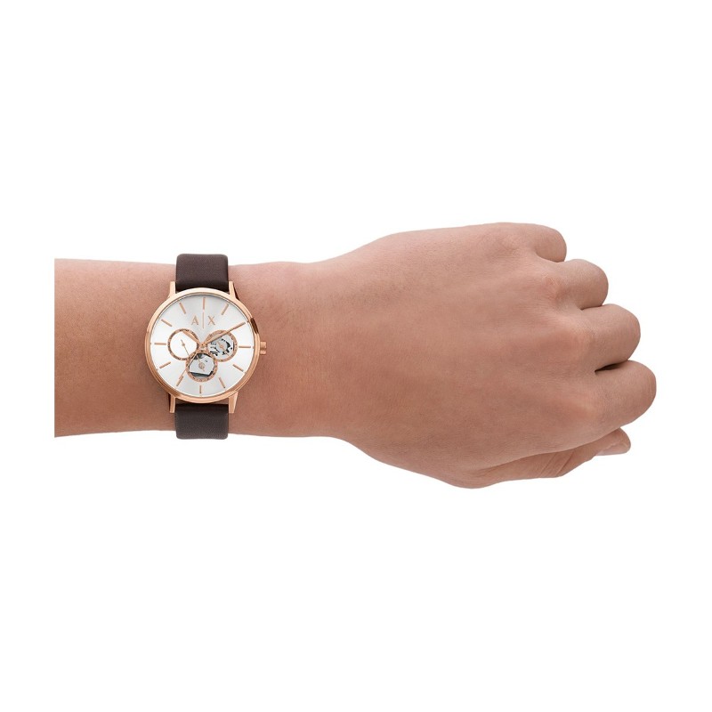 С часовника Armani Exchange AX2756 Cayde ще се наслаждаваш на изключително стилно изживяване всеки ден. Кафявата естествена кожа на каишката допълва сивия циферблат, създавайки елегантен и модерен вид, който ще привлече вниманието на всички около теб. Кварцовият механизъм гарантира точност и надеждност, а наличието на календар ще ти помогне да следиш ангажиментите си без усилие. С изгодна цена, този часовник е перфектният аксесоар, който да подчертае твоята индивидуалност и стил. Носейки го, ще се чувстваш уверен и привлекателен.