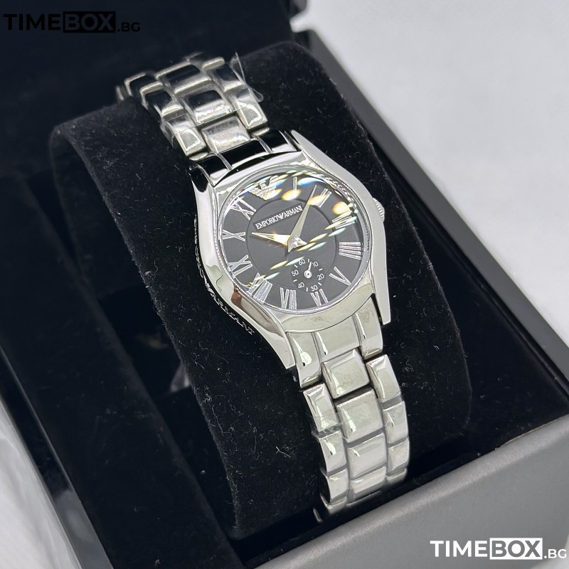 Моделът AR0695 от престижната колекция Valente на Emporio Armani е символ на висока мода и безпогрешен вкус. Този дамски часовник съчетава класическия контраст между полирана сребриста стомана и наситено черен циферблат, създавайки аксесоар, който излъчва увереност и дискретен лукс. В горната част на дисплея гордо стои емблематичното лого с орел, което моментално идентифицира притежателя му като ценител на дизайнерското качество.