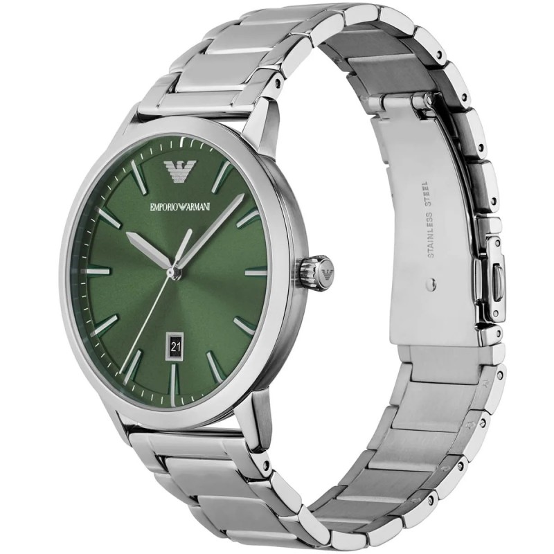 Emporio Armani AR11575 от серията Ruggero е въплъщение на смелия съвременен дизайн и италианската елегантност. Този изключителен мъжки часовник се отличава с 43мм корпус от неръждаема стомана с mat финиш и завладяващ тъмнозелен (dark green) sunray циферблат, който прави впечатление с богатия си цвят и игра на светлината. Стоманената верижка със сребърно покритие и butterfly clasp осигуряват сигурност и комфорт, докато кварцовият механизъм гарантира прецизност. Baton маркерите, датовият прозорец на 6-часовата позиция и минералното стъкло правят този часовник идеален за мъже, които търсят statement piece с модерна естетика.