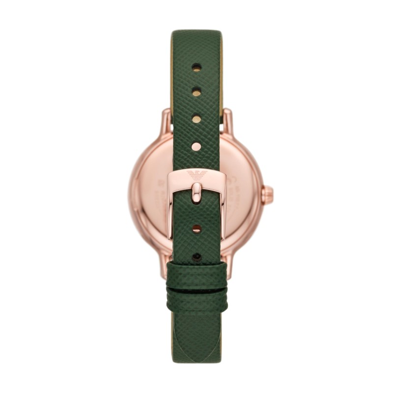 С елегантен диаметър от 32 мм, този модел е с класически размери, идеални за дамска китка. Той е и изключително тънък (само 8 мм дебелина), което го прави удобен за носене дори под тесни маншети. Зеленият циферблат е с изчистен "sunray" (слънчев) ефект, който отразява светлината по фин начин, а изчистените златни индекси и логото на Armani на 12 часа завършват луксозната визия.