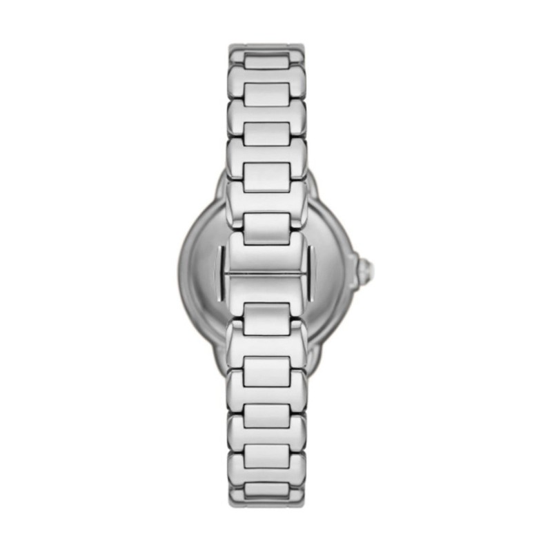 Този дамски часовник Emporio Armani AR11632 от колекцията Mia е перфектният пример за модерен лукс. Неговото основно предимство е изтънченият блясък, постигнат чрез инкрустирани кристали, които украсяват както безела (пръстена около стъклото), така и индексите на часовете. Те създават красив контраст със сивия "sunray" (слънчев) циферблат.