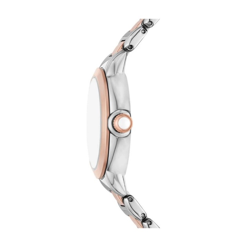 Този дамски часовник Emporio Armani AR11643 от колекцията Mia е перфектният пример за модерен, бижутериен дизайн. Ключовото му предимство е елегантната двуцветна (bi-color) верижка, която съчетава класическо сребристо с модерни акценти в цвят розово злато. Тази комбинация го прави изключително гъвкав аксесоар, лесен за съчетаване с различни бижута.