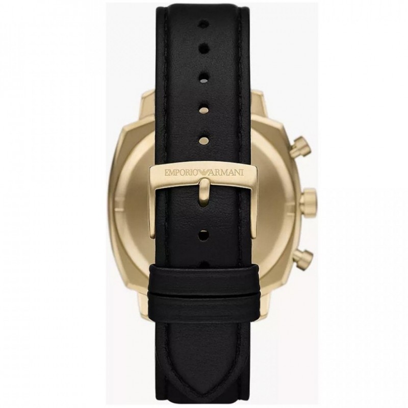 Мъжкият часовник Emporio Armani AR11690 от колекцията Carlo е майсторска комбинация между класически винтидж дизайн и модерна функционалност. Този часовник привлича погледа със своята нестандартна, възглавнична (cushion-shaped) форма на корпуса в изискан златист тон, която му придава отличителен и аристократичен вид. Контрастният черен циферблат с хронограф и златни акценти създава динамично, но елегантно излъчване. Каишката от еко кожа подчертава ангажимента на марката към устойчивост, без да прави компромис с луксозното усещане. Това е часовник за мъжа, който цени изтънчеността и детайлите.