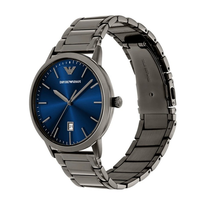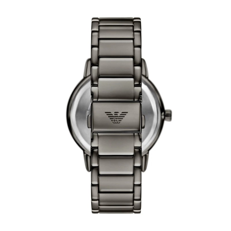 - Циферблат: Сив цвят с релефна хоризонтална текстура и емблематичното лого на Emporio Armani на позиция 12 часа.