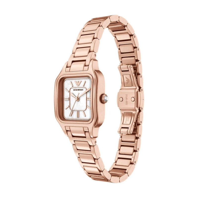 - Циферблат: Основа от бял седеф, допълнена от блестящи инкрустирани кристали на позициите за часовете и логото на Emporio Armani на 12 часа.