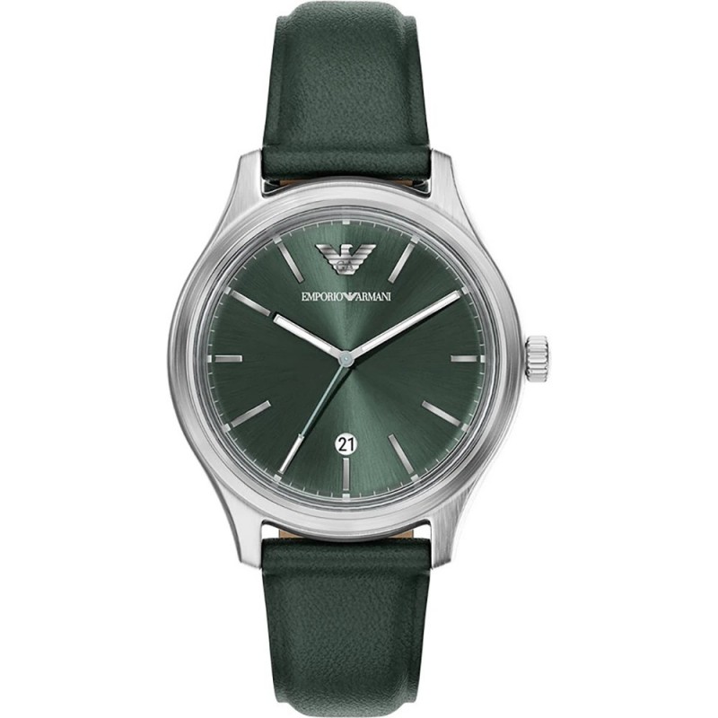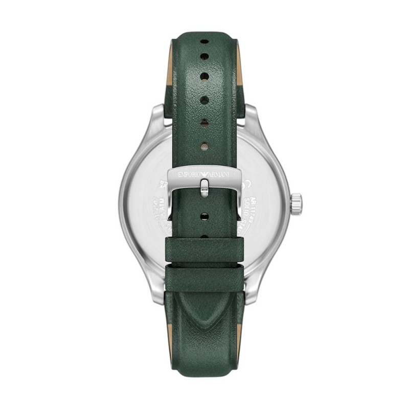 - Циферблат: Зелен "sunray" циферблат със сребристи стрелки, линейни индекси и емблематичното лого на Emporio Armani на позиция 12 часа.