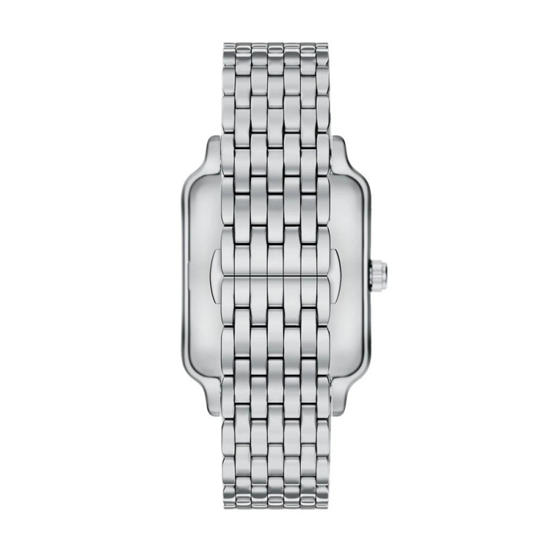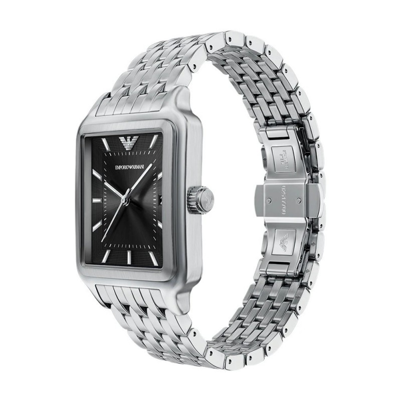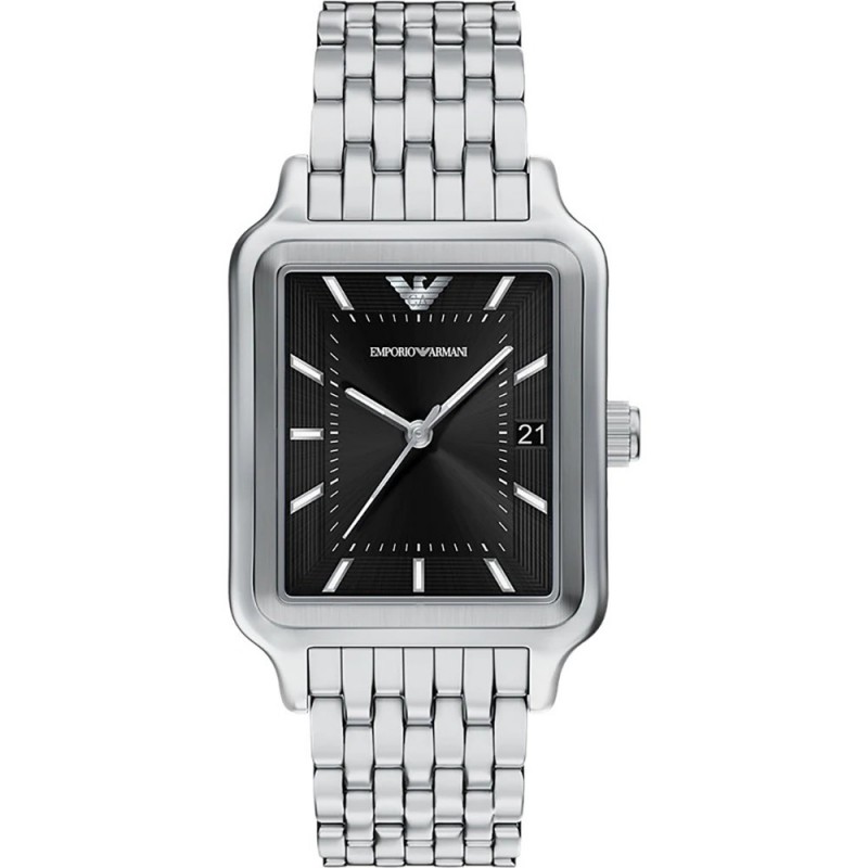 - Циферблат: Класически черен циферблат с фино текстурирани детайли, сребристи маркери за часовете и логото на Emporio Armani.