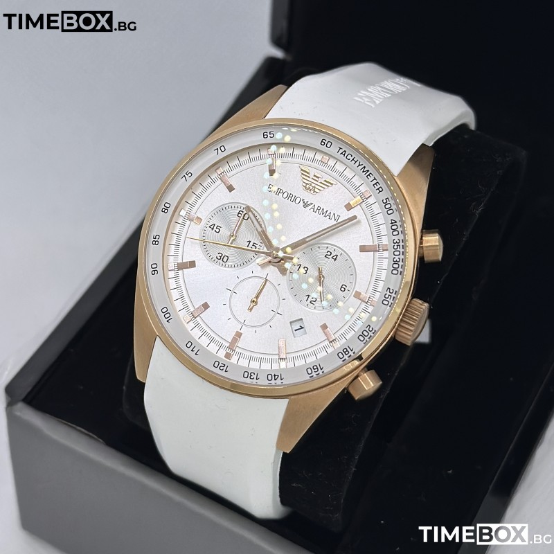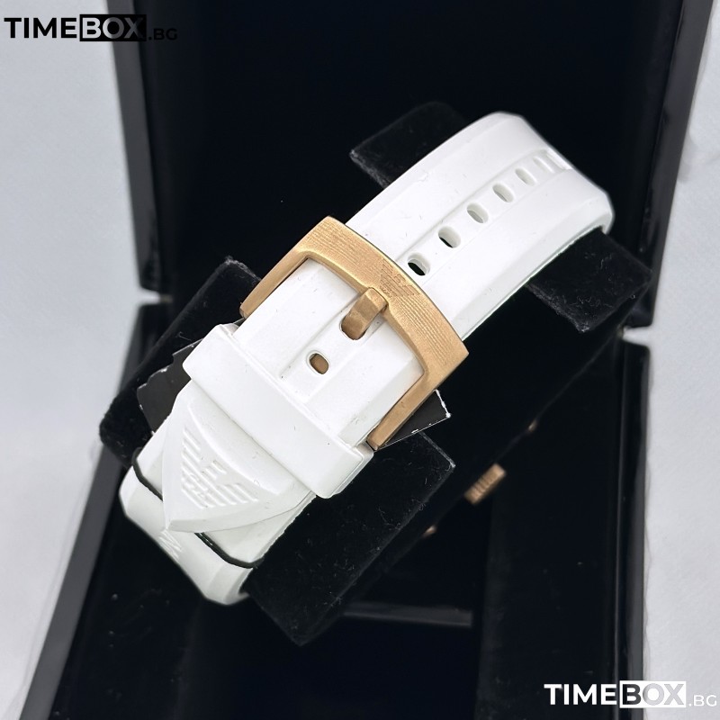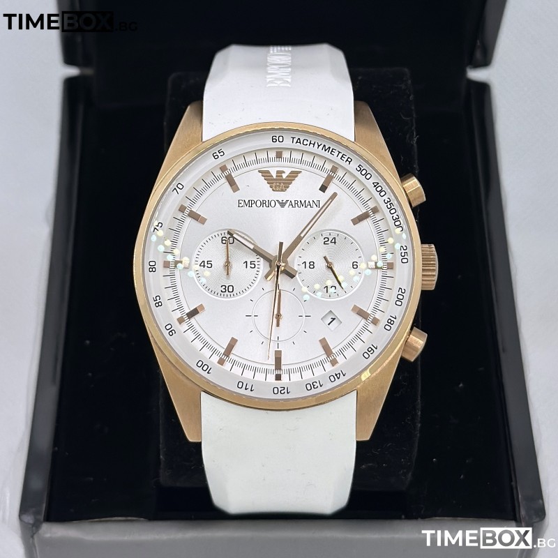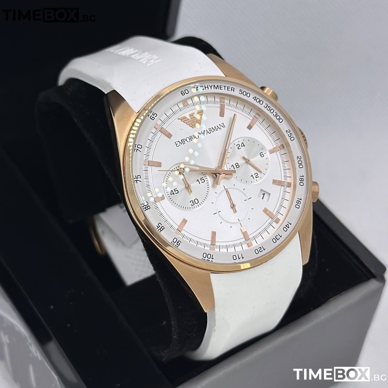 С този мъжки часовник от Emporio Armani вие ще пренесете стила си на ново ниво. Моделът от колекция Sportivo предизвиква вълнение със своето съчетание от елегантност и функционалност. Полираният корпус в цвят розово злато и удобната бяла силиконова каишка създават впечатляваща и модерна визия. Часовникът е с бял циферблат и луминесцентни стрелки, които осигуряват лесно разчитане на времето, а хронографът и тахометърът добавят практичност. С този модел вие ще изживеете стил и иновации, предлагайки уникален дизайн и качество от марката Emporio Armani.