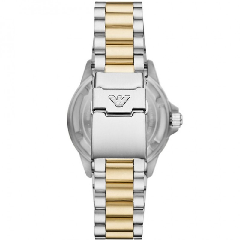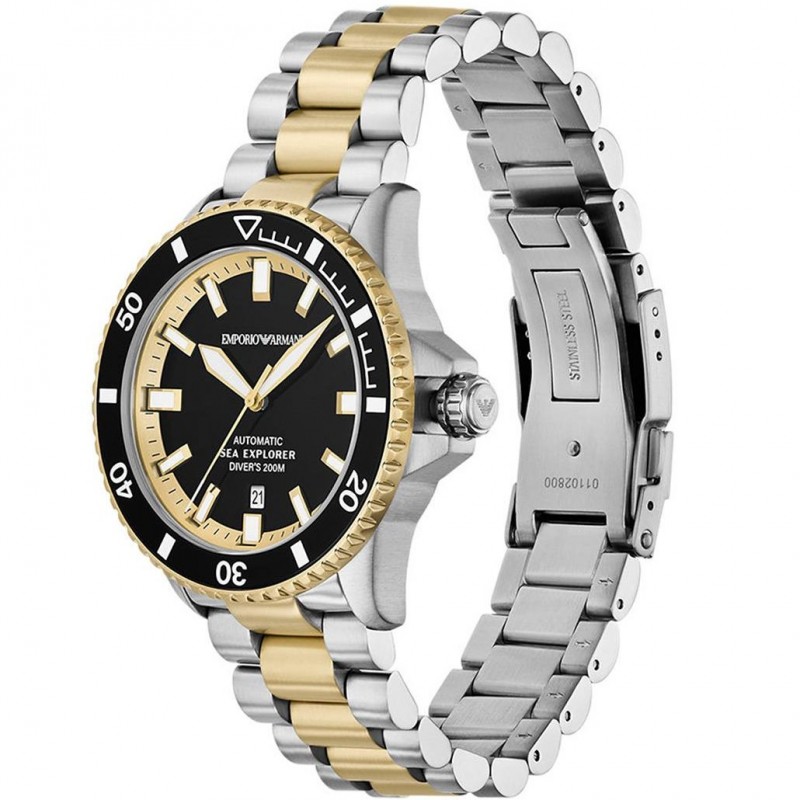 Мъжкият часовник Emporio Armani AR60089 от серията Sea Explorer е перфектното съчетание на италиански дизайн и функционалност на водолазен часовник. Този модел е създаден за модерния мъж, който цени както високото качество и стил, така и надеждността при всякакви условия. Основното предимство е автоматичният механизъм, който работи без батерия – захранва се от движението на Вашата ръка. Двуцветната верижка в сребристо и златисто и черният емайлиран циферблат придават на часовника забележителна и луксозна визия. Моделът разполага и с еднопосочно въртящ се безел за измерване на времето при гмуркане, което подчертава неговия спортен произход.