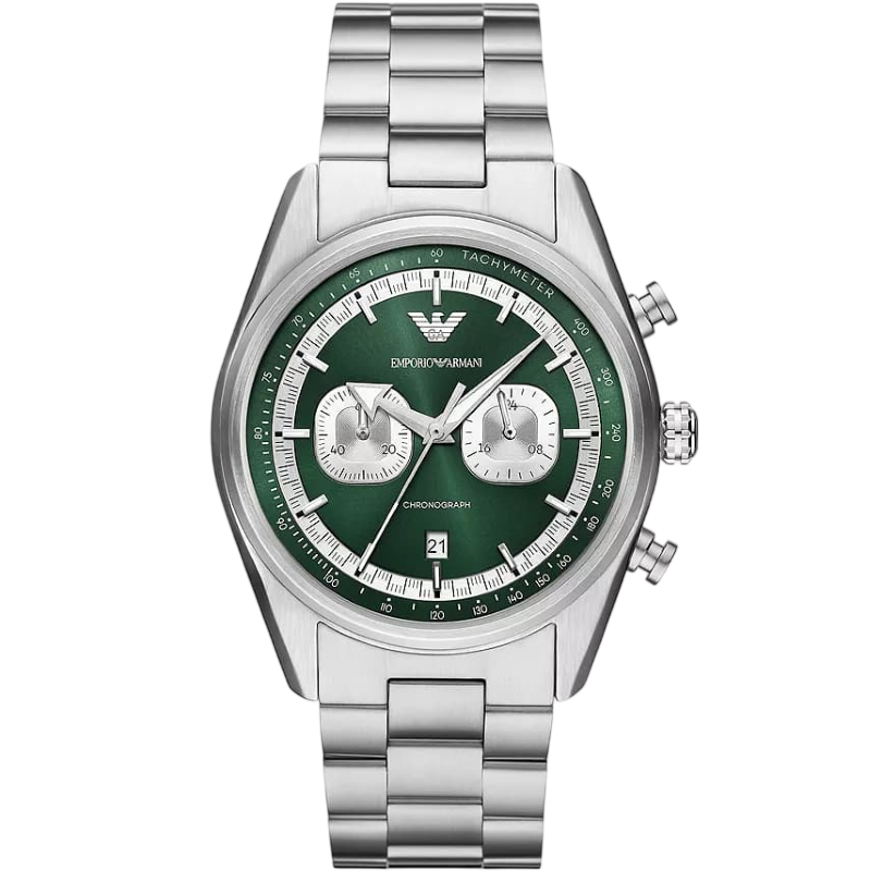 Този спортно-елегантен хронограф е от колекция Racer и е с прецизен кварцов механизъм. Зеленият циферблат е със слънчев ефект (Sunray) и контрастни субциферблати (често сребристи), които му придават дълбочина. Включеният календар осигурява допълнителна функционалност. Emporio Armani е символ на съвременен лукс. Превърни всеки миг в стилно изживяване!