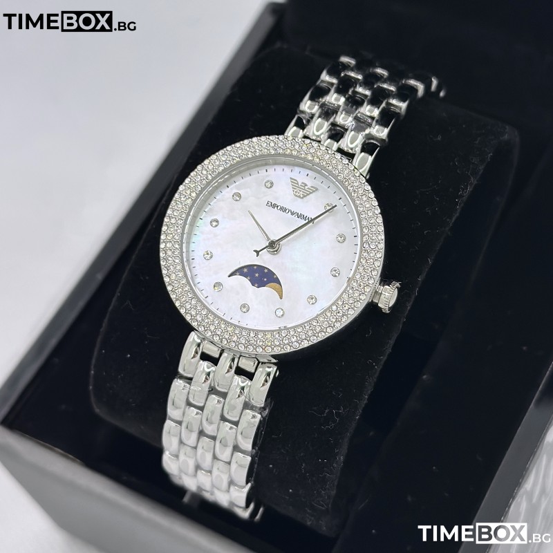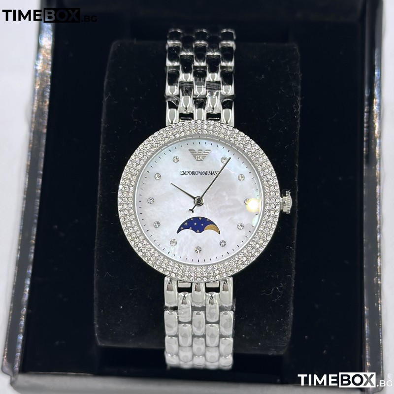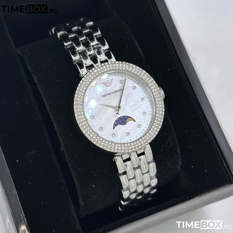 Този модел е с тънък профил и деликатен 32 мм корпус. Белият циферблат е със Седефен ефект (Mother-of-Pearl) и разполага с функция Лунна фаза (Moonphase) – атрактивен субциферблат, който показва фазите на луната. Безелът е инкрустиран с кристали за допълнителен лукс. Този часовник не само ти предоставя надеждност и точност чрез кварцовия механизъм, но и излъчва безупречен стил, характерен за марката Emporio Armani.