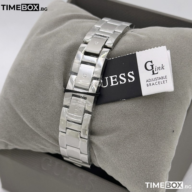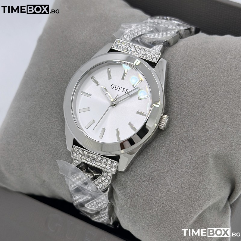 - Циферблат: Сребрист със слънчев ефект (sunray), декориран с кристали, които формират логото на Guess.