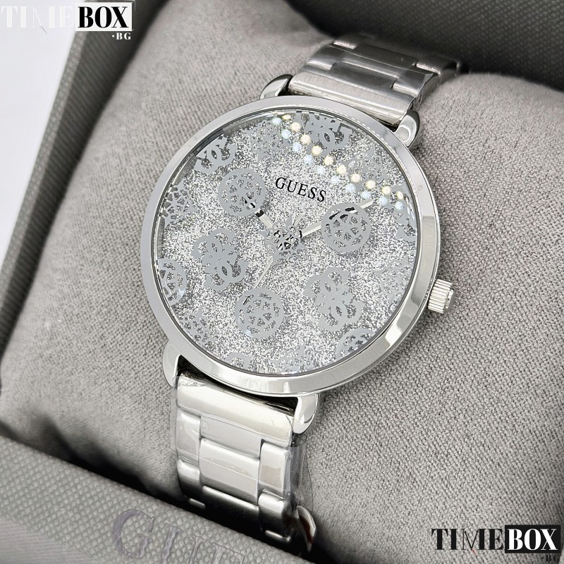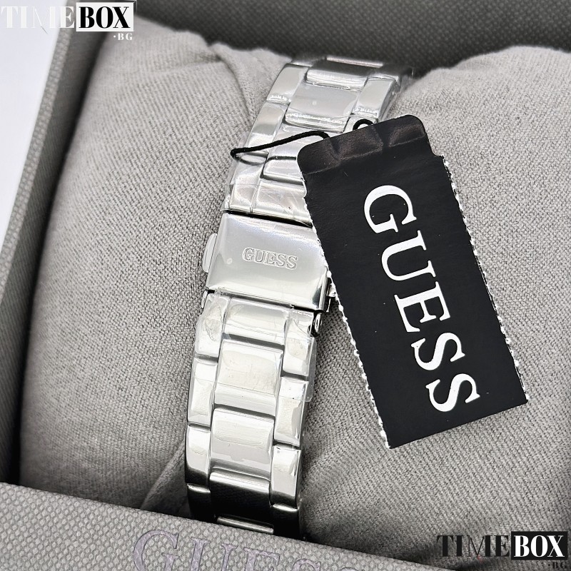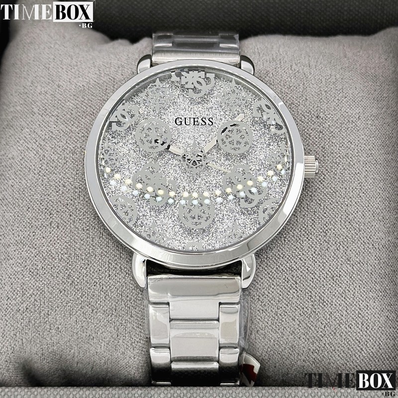 - Циферблат: Сребрист, с декорация от логото на Guess и инкрустирани кристали по ринга.