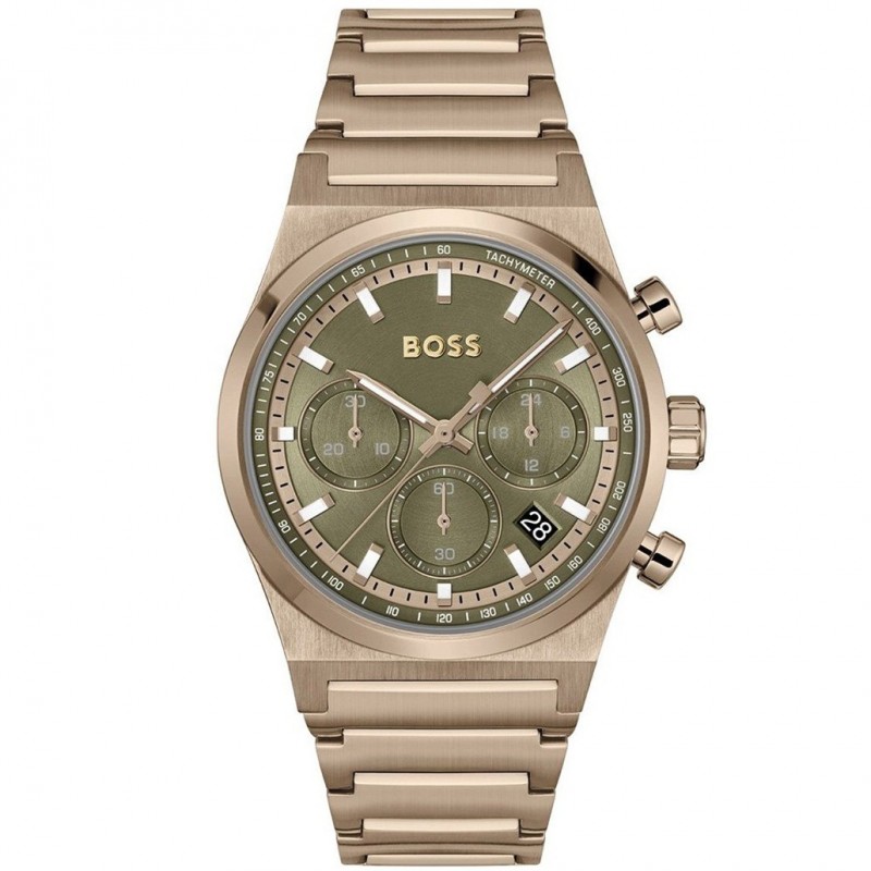 Открийте изтънчеността и безупречния стил, вплетени в този мъжки часовник Hugo Boss, модел 1514222. Този впечатляващ хронограф е създаден, за да подчертае индивидуалността на модерния мъж. Със своя уникален маслиненозелен циферблат и златисто покритие, този часовник се откроява със своята елегантност и модерно излъчване. Той не просто отмерва времето, а разказва история за класа и внимание към детайла. Неговият дизайн, съчетан с прецизен кварцов механизъм, гарантира надеждност и безупречна работа.