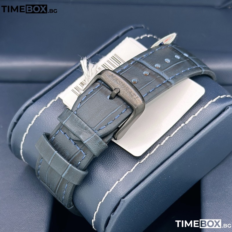 PVD покритието (Physical Vapor Deposition) осигурява изключителна устойчивост на износване и запазва дълготрайно gun metal цвета. Синята кожена каишка е вдъхновена от спортните интериори на автомобилите Maserati и добавя цветен акцент към мъжествения дизайн. Кварцовият механизъм гарантира швейцарска точност при минимална поддръжка.