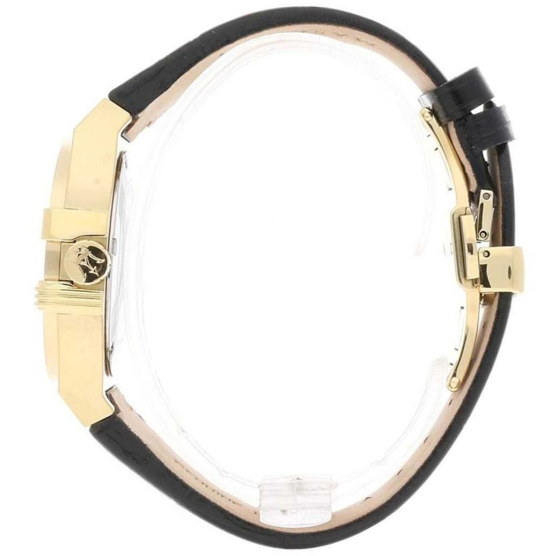 Дамският часовник Maserati Potenza R8851108505 е въплъщение на италианската страст към автомобилите, пренесена в света на луксозните часовници. Този модел от прочутата колекция Potenza съчетава спортен дух с изтънчена женственост, създавайки уникален аксесоар за активната и самоуверена жена. Златистата каса от висококачествена неръждаема стомана хармонично се съчетава със сребърния циферблат и черната кожена каишка, създавайки елегантен контраст, който привлича вниманието. Емблематичният тризъбец на Maserati, вдъхновен от статуята на Нептун в Болоня, придава на часовника неповторим автомобилен чар и престиж.