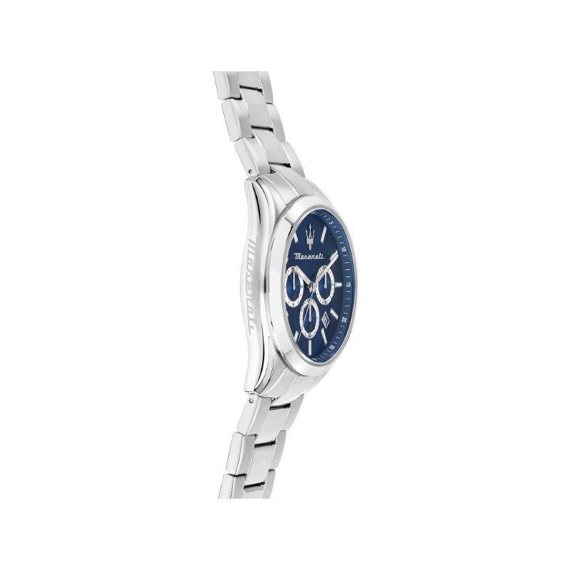 Maserati Attrazione R8853151005 е многофункционален часовник, който въплъщава модерния дизайн и динамичната елегантност на италианската марка. Синият циферблат със солей ефект създава завладяващ визуален акцент, допълнен от сребристи индекси и стрелки. Тройните суб-циферблата подчертават функционалността му, докато датовият прозорец между 4 и 5 часа добавя практичност към ежедневната употреба. Колекцията Attrazione се отличава с изчистена и симетрична геометрия, която съчетава спортната технология с високо полиран и изтънчен подход.