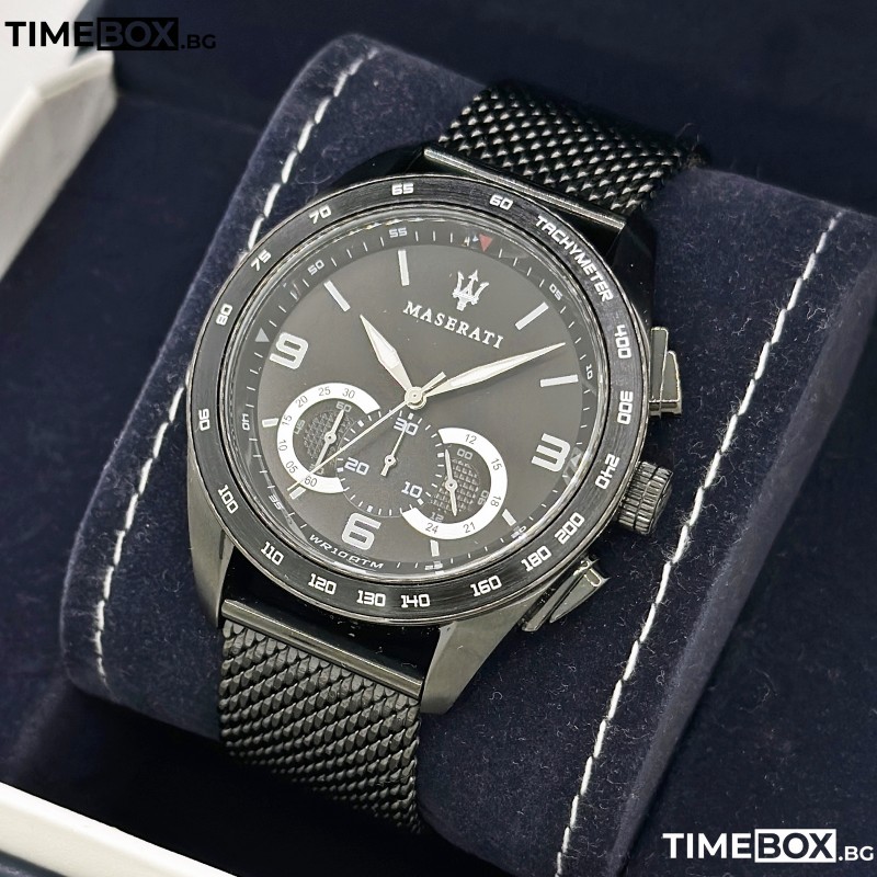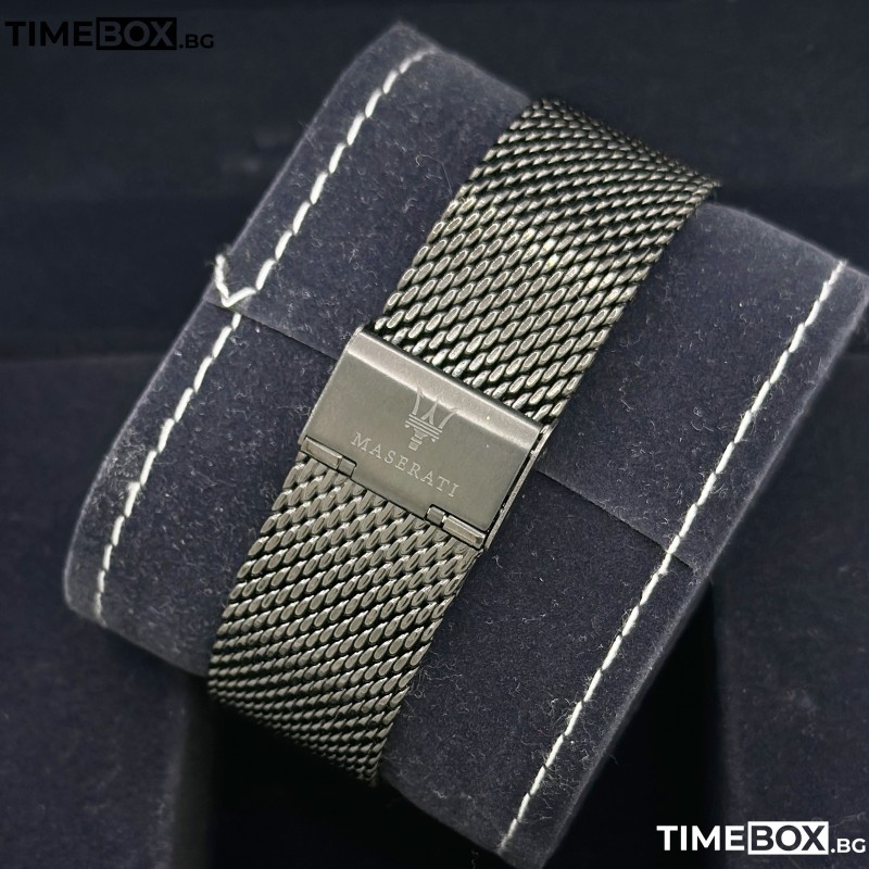 - "Много красив мъжки хронограф Maserati със стоманена mesh каишка и бърза настройка. Доставен защитен със стикери в кутия. Много красив продукт."