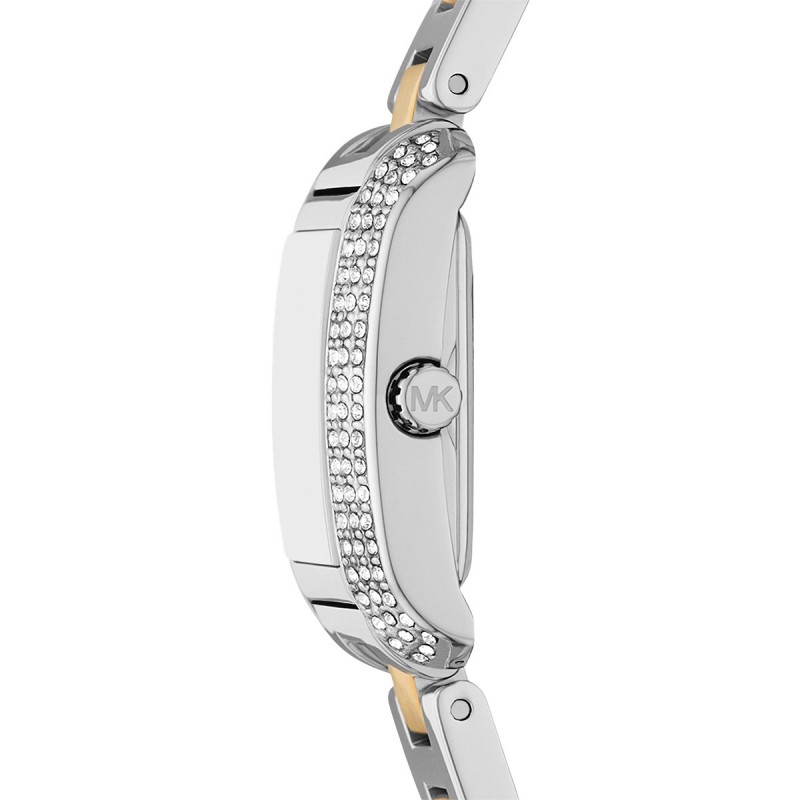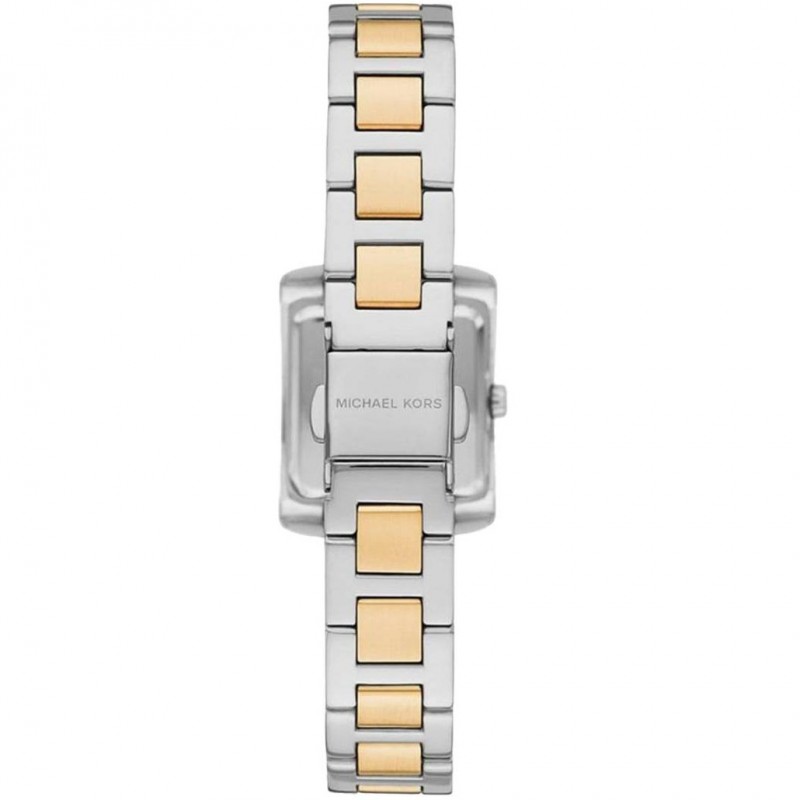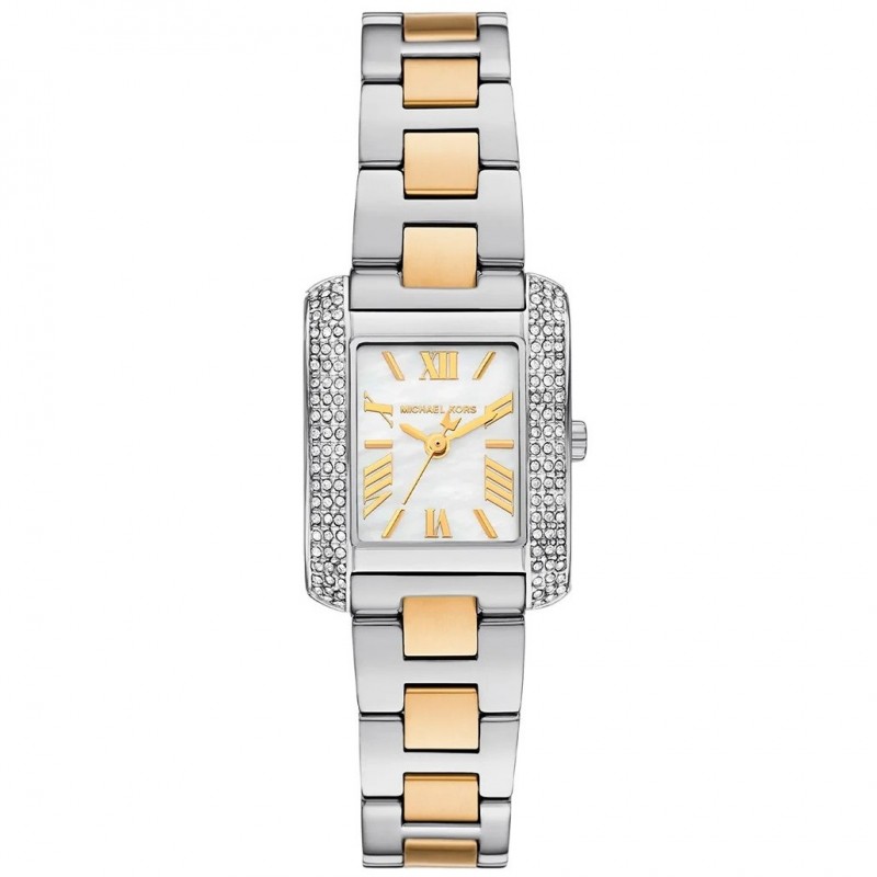 Часовникът Michael Kors Emery MK4882 представя уникален дизайн с правоъгълна форма на корпуса, който се отличава от традиционните модели. Този изискан времемер съчетава двутонова цветова гама от сребро и злато с перлена циферблат, създавайки неповторим визуален ефект. Кристалните елементи по страните на корпуса добавят луксозен блясък, правейки този часовник истинско бижу за всяка жена, която цени качеството и стила. Компактният 22мм корпус го прави идеален за деликатната женска ръка, без да компрометира елегантността.