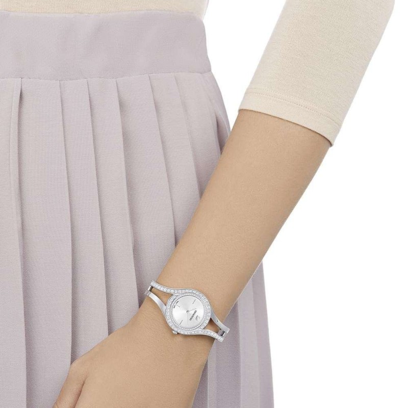Моделът Swarovski 5377545 от престижната колекция Eternal е истинско произведение на изкуството, което пренася бижутерийната естетика върху китката. Този часовник се отличава с уникалния си дизайн, вдъхновен от органичните форми и непреходния блясък на кристалите. Специфичното при него е асиметричното разположение на два реда искрящо бели кристали Swarovski върху безела, които създават динамичен и луксозен ефект.