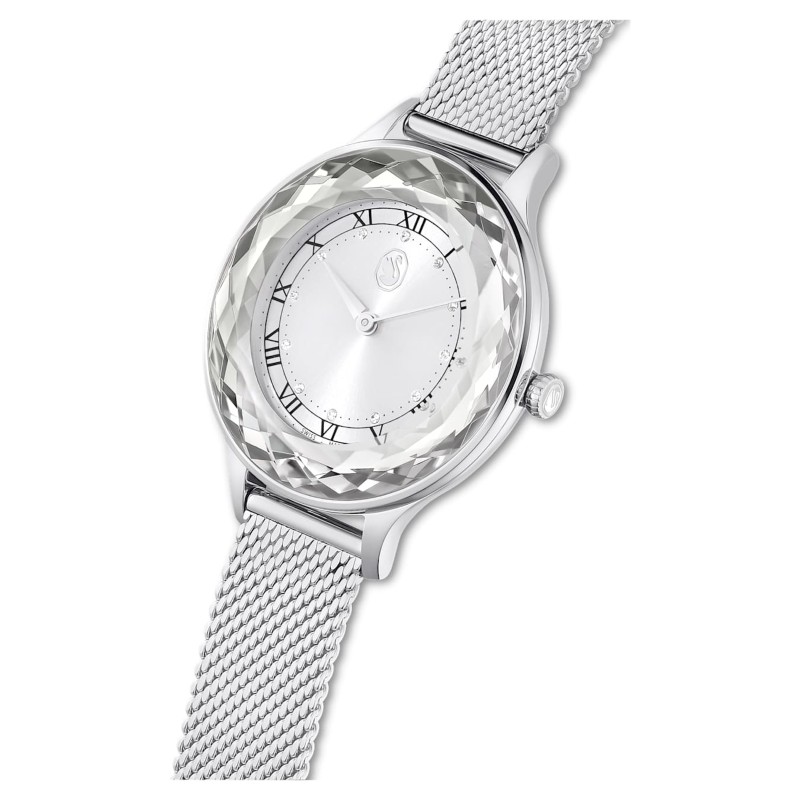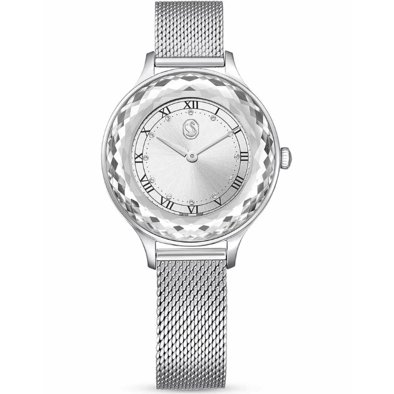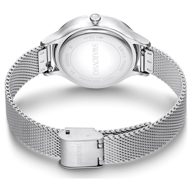- Циферблат: Сив (тип "слънчев лъч") с кристални индекси и логото на Swarovski на 12 часа.