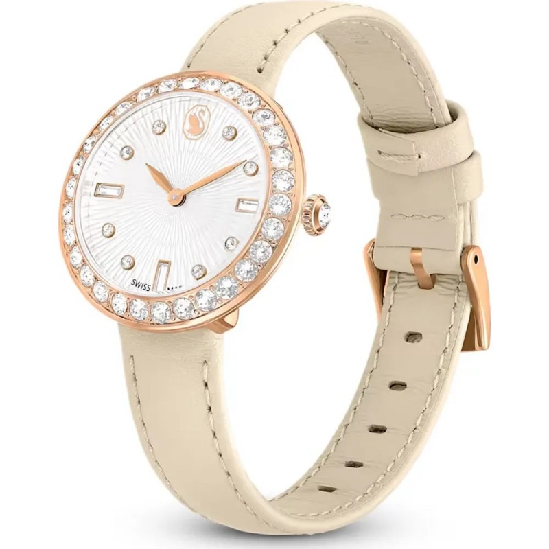 Часовникът Swarovski Certa модел 5672968 представя перфектната симбиоза между швейцарското качество и изтънчената кристална красота. Този изискан дамски часовник от колекцията Certa се отличава с компактен 30 мм корпус в розово-златен тон и безел, декориран с 30 павета Swarovski кристала. Завладяващият guilloché циферблат с лебеда на Swarovski на позиция 12 часа създава неповторим визуален ефект.