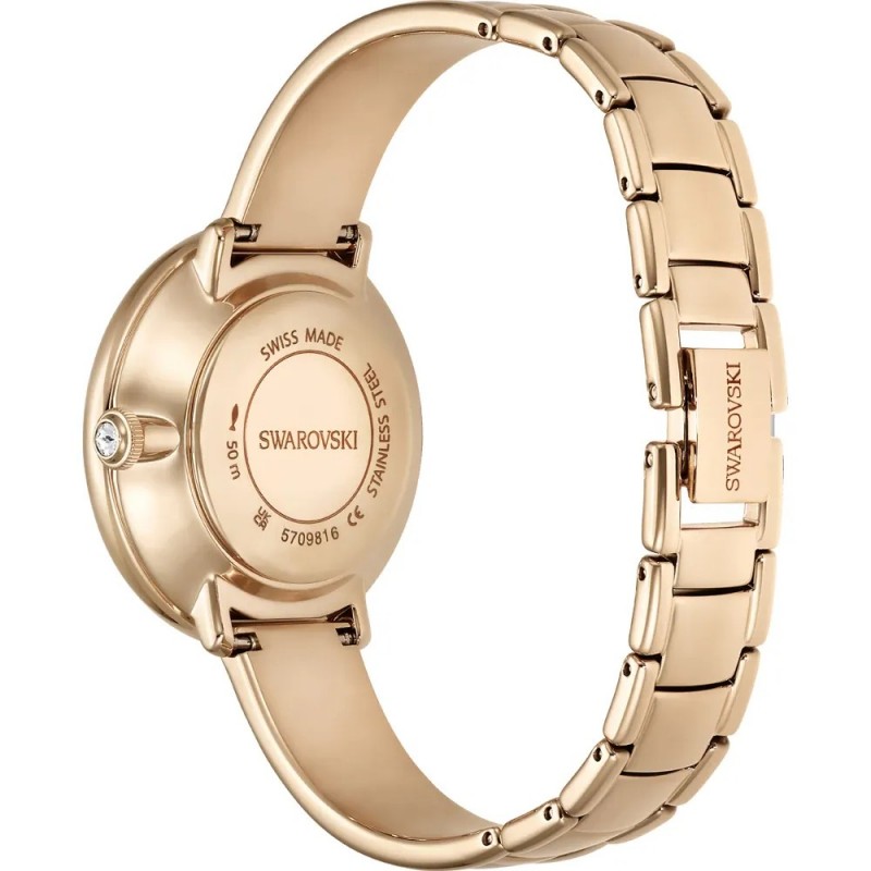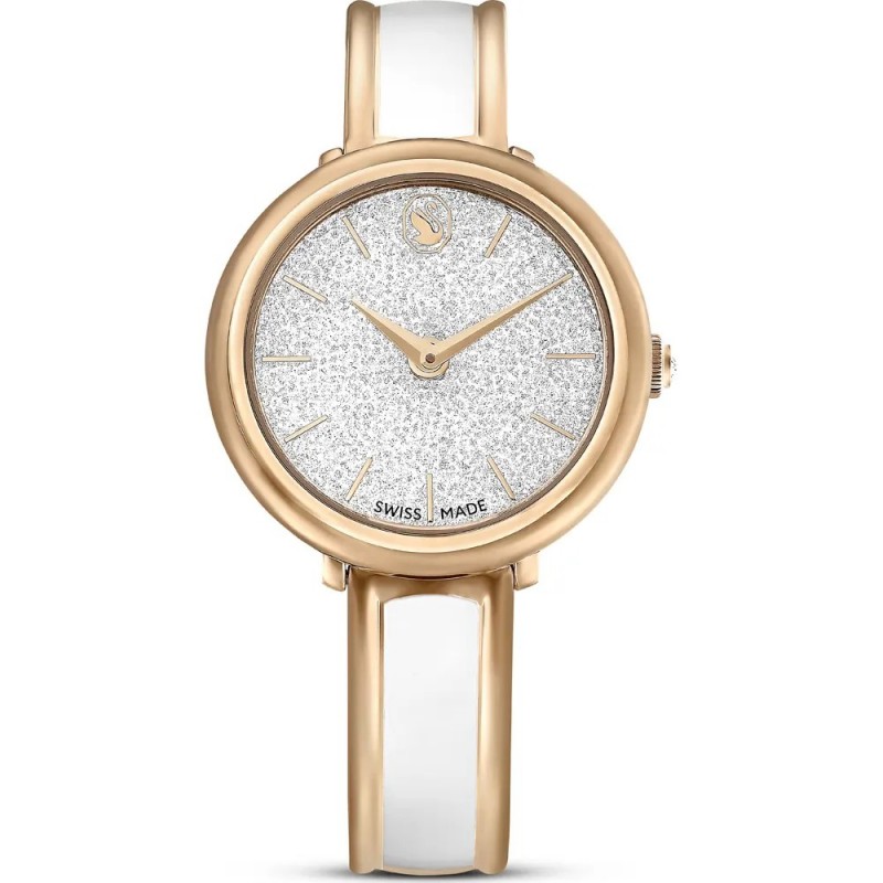 Този изисканият часовник представлява уникалната Crystalline техника на Swarovski, която прави циферблата истинско произведение на изкуството. Часовникът съчетава функционалността на швейцарска точност с блясъка на близо 1,016 кристала, разположени върху циферблата в завладяваща мозайка от светлина. Rose gold покритието придава топъл и луксозен вид, докато бялата емайлова секция на гривната добавя елегантен контраст.