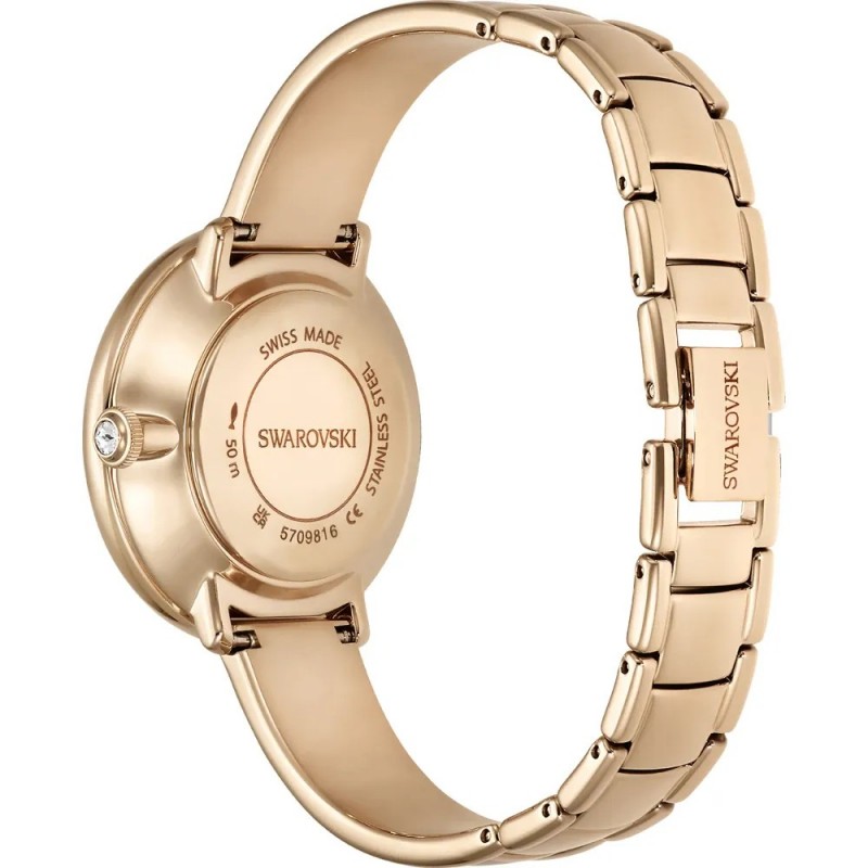 Часовникът Swarovski Crystalline Bangle 5709816 представлява перфектната комбинация между бижу и часовник, създаден за жената, която търси ежедневен лукс. Този изискан модел от колекцията Crystalline Bangle впечатлява с 32-милиметров стоманен корпус с розово-златно PVD покритие и уникален циферблат, декориран с около 1,016 кристала, които искрят между изящните часови маркери.