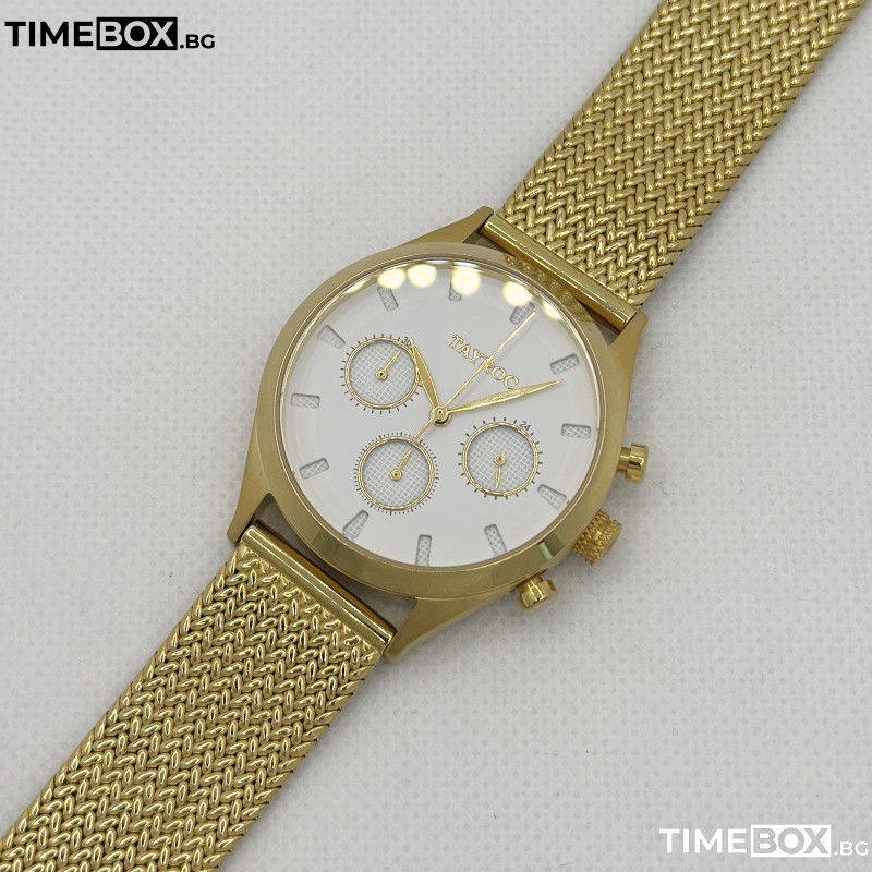 Дамският часовник Tayroc TY51 е истинско бижу за дамите, които ценят блясъка на златото и силата на минималистичния дизайн. Със своята изящна изработка в жълто злато (Yellow Gold) и изчистен бял циферблат, този модел е символ на непреходна елегантност. Той съчетава модерната естетика на бранда Tayroc с класическата визия на луксозния аксесоар.