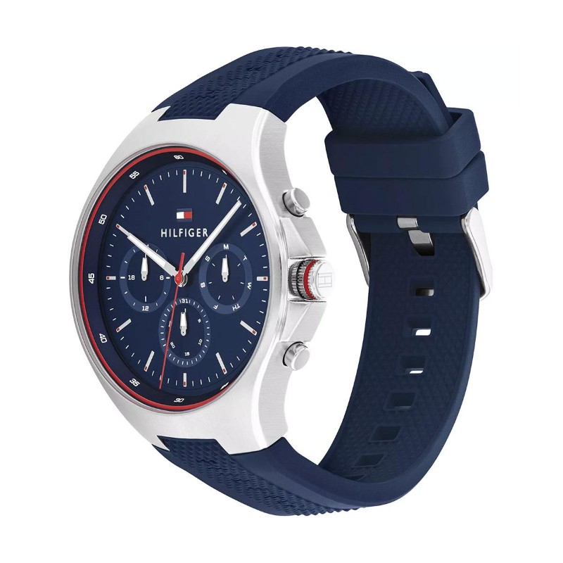 Запознай се с мъжкия часовник Tommy Hilfiger 1792057 Justin, който е съчетание от модерен дизайн и практичност. Със своя син циферблат и удобна силиконова каишка, той е идеален за активния мъж, който цени комфорта и стила.
